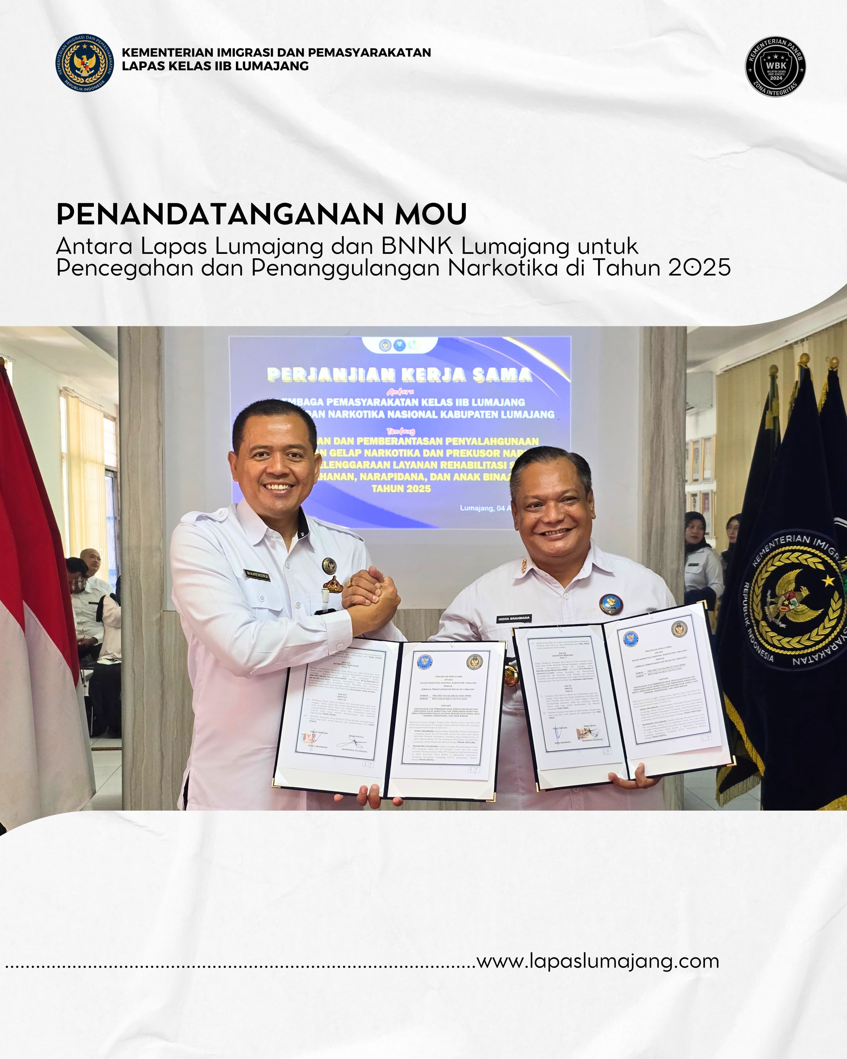 Lumajang — Dalam upaya memperkuat sinergi dalam pencegahan dan pemberantasan penyalahgunaan serta peredaran gelap narkotika dan prekursor narkotika, Lembaga Pemasyarakatan (Lapas) Kelas IIB Lumajang dan Badan Narkotika Nasional Kabupaten (BNNK) Lumajang resmi menandatangani perjanjian kerjasama (MoU), Senin (04/08), bertempat di aula Lapas Lumajang.
